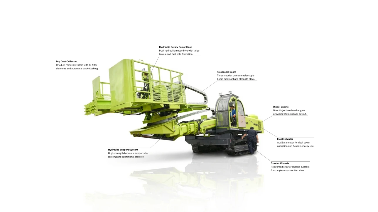 Built on a robust crawler chassis with a three-section hydraulic telescopic boom, the AK180 offers excellent mobility, stability, and adaptability in complex terrains. The rig’s efficient dry dust removal system with automatic back-flushing filter elements enhances operator safety and environmental compliance, while the multi-angle drilling capability (vertical 90° to 65° elevation) ensures flexible operation in foundation pits, slope protection, and other civil engineering projects.