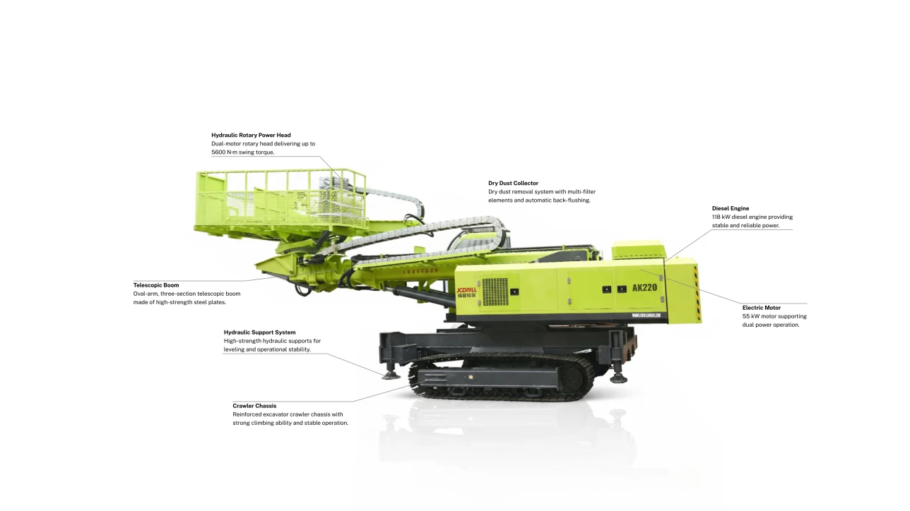 Equipped with a three-section full hydraulic telescopic boom, the AK220 provides excellent reach and flexibility in confined or uneven terrains. The rig supports multi-angle drilling from 90° vertical to 65° elevation, and its efficient dry dust removal system with 12 filter elements and automatic back-flushing enhances operator safety, environmental compliance, and overall productivity in complex construction environments.