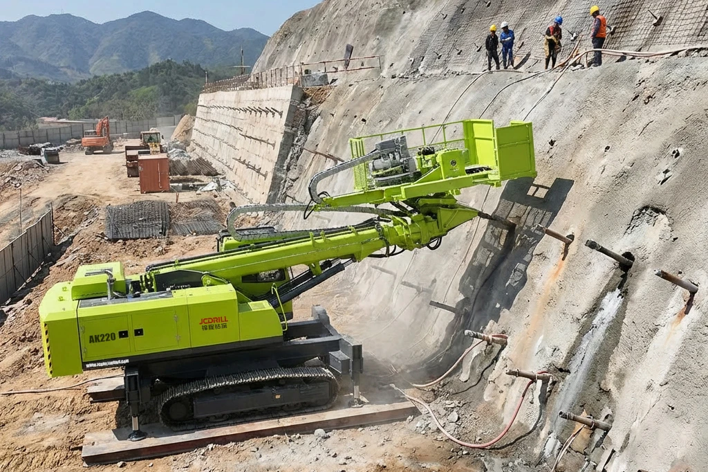 The AK220 is a crawler-mounted anchoring drilling rig designed for slope protection and engineering construction applications. It is suitable for drilling in soil layers, sand and pebble layers, and weathered rock formations. The rig adopts a diesel engine and motor dual power system combined with a motor-driven hydraulic rotary power head and chain propulsion mechanism. With stepless speed regulation, multiple drilling angles, and a full hydraulic telescopic boom, the AK220 delivers reliable performance, high efficiency, low failure rate, and easy maintenance in complex construction environments.