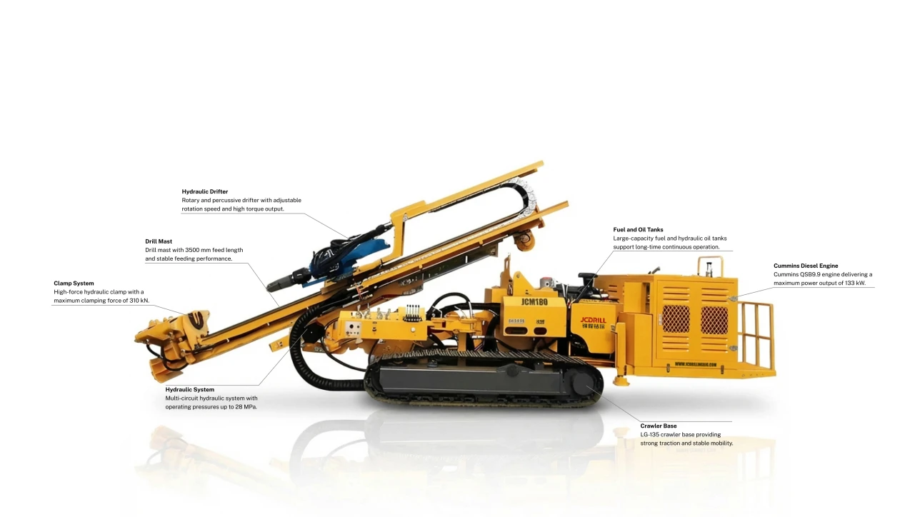 Powered by a Cummins diesel engine and a stable multi-circuit hydraulic system, the JCM180 delivers high torque of up to 13,600 N·m and smooth, reliable operation. Fully hydraulic control enables easy, low-maintenance handling of drilling, feeding, and rotation functions. Compact design, robust crawler mobility, and optional attachments such as customized clamps, auxiliary tools, and electric drive configurations make the JCM180 suitable for slope support, foundation reinforcement, tunnel anchoring, and other demanding civil engineering projects.