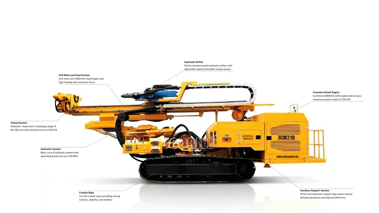 Powered by a 154 kW Cummins engine and equipped with a multi-circuit hydraulic system, the JCM210 delivers high torque of up to 8,600 N·m, smooth feed operation with 4200 mm stroke, and reliable, efficient penetration. Its fully hydraulic control enables precise, low-maintenance handling of all drilling, lifting, and positioning functions, making it ideal for slope stabilization, foundation reinforcement, tunnel anchoring, and other demanding civil engineering projects. Optional configurations include clamp sizes, auxiliary winches, and specialized hydraulic systems for customized construction requirements.