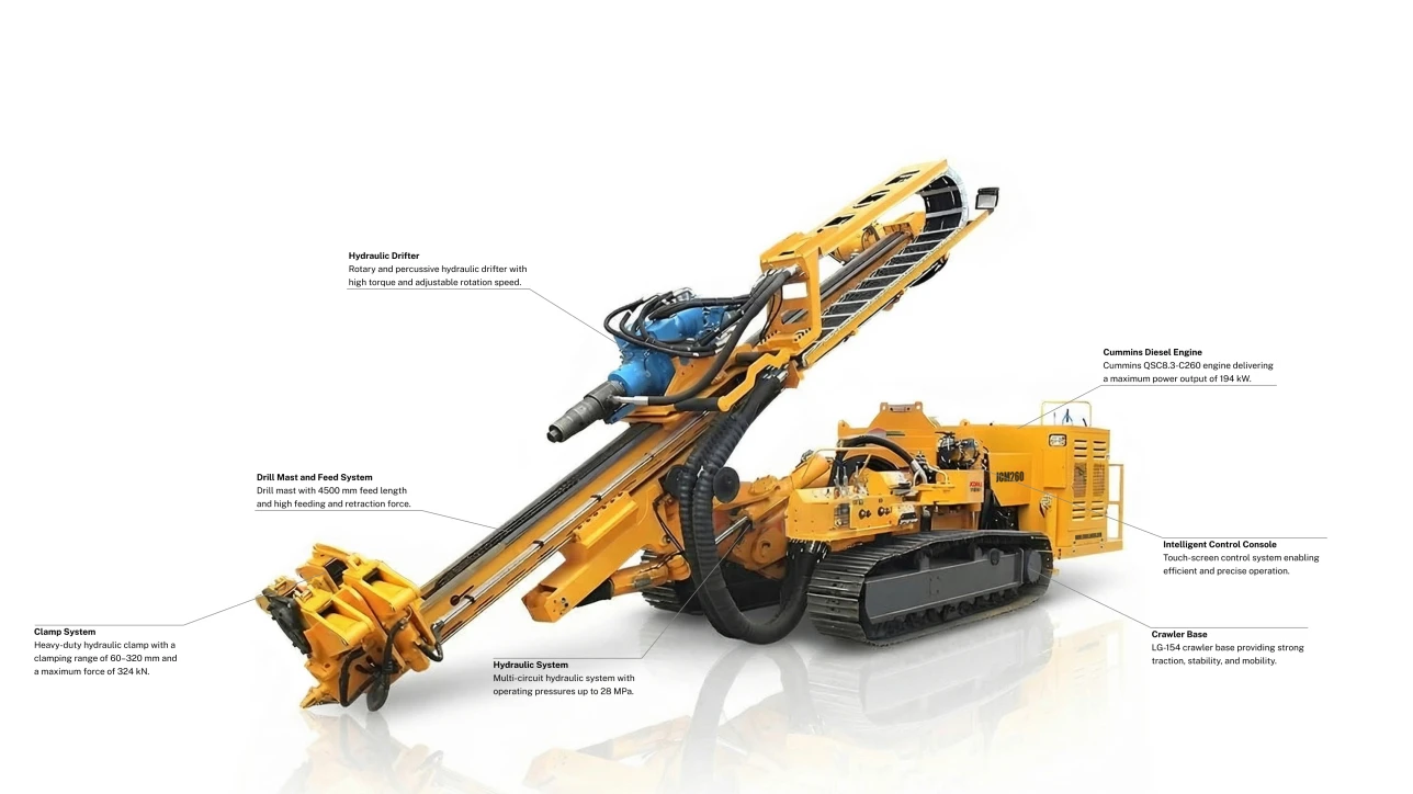 Powered by a 194 kW Cummins engine, the JCM260 offers ultra-high torque output of up to 17,000 N·m at low speed, ensuring strong penetration and efficient drilling performance in hard formations. The multi-circuit hydraulic system ensures smooth power distribution and operational reliability, while the integrated intelligent control system with a 7-inch touch screen enables real-time monitoring of drilling parameters. With flexible OEM customization options, the JCM260 is an ideal solution for high-standard civil engineering, mining, and geotechnical anchoring applications.