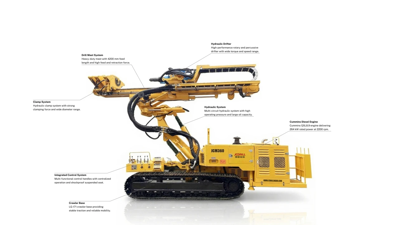 The JCM360 is a high-power full hydraulic anchoring drilling rig designed to meet the requirements of large diameter micro-pile and deep borehole construction. Equipped with a Cummins QSL8.9 engine and a high-torque hydraulic drifter, it delivers outstanding performance in demanding geological conditions. Its multi-articulation structure provides excellent visibility of the borehole mouth, while the three-clamp system simplifies drill rod handling. With precise azimuth monitoring and integrated control, the JCM360 significantly improves drilling accuracy, setup efficiency, and overall construction productivity.