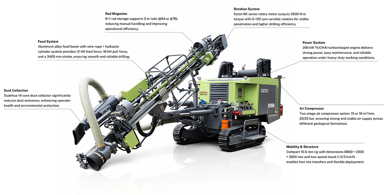 The JC106A is a versatile DTH drilling rig for shallow to medium rock drilling, offering up to 21 m depth and φ90–152 mm hole diameters. Powered by a 206 kW YUCHAI engine with a two-stage air system (15/18 m³/min, 20–22 bar), it features an Eaton 6K rotation motor delivering 3500 N·m torque. A hydraulic wire-rope feed system, 14-core dust collector, IP56 electrical components, and 6+1 rod storage ensure stable, efficient, and reliable performance.
