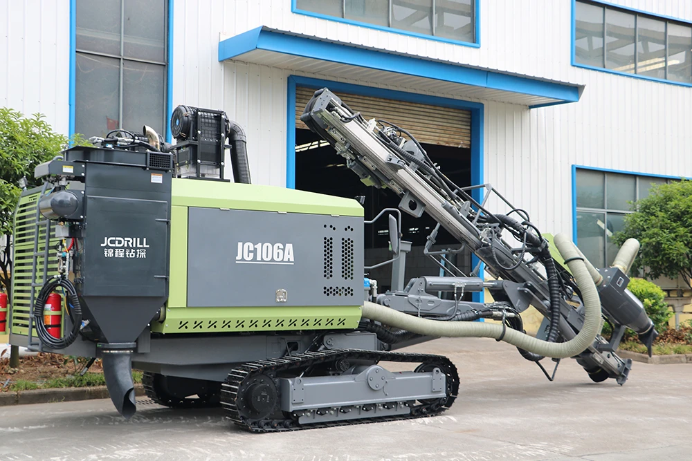 Equipped with an Eaton 6K rotary motor providing up to 3500 N·m torque, a hydraulic wire-rope feed system, and an automatic 6+1 rod magazine, the JC106A enables smooth drilling operations with reduced manual handling and improved efficiency. Its compact structure, crawler-mounted mobility, advanced dust control system, and IP56-rated electrical components ensure safe, stable, and environmentally friendly operation, making it an ideal solution for rock blasting hole drilling and surface construction projects.