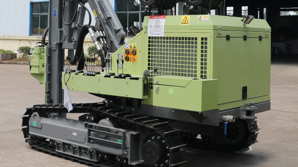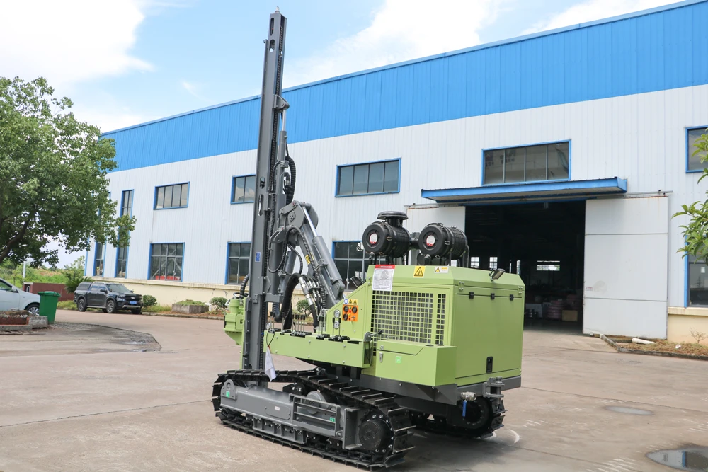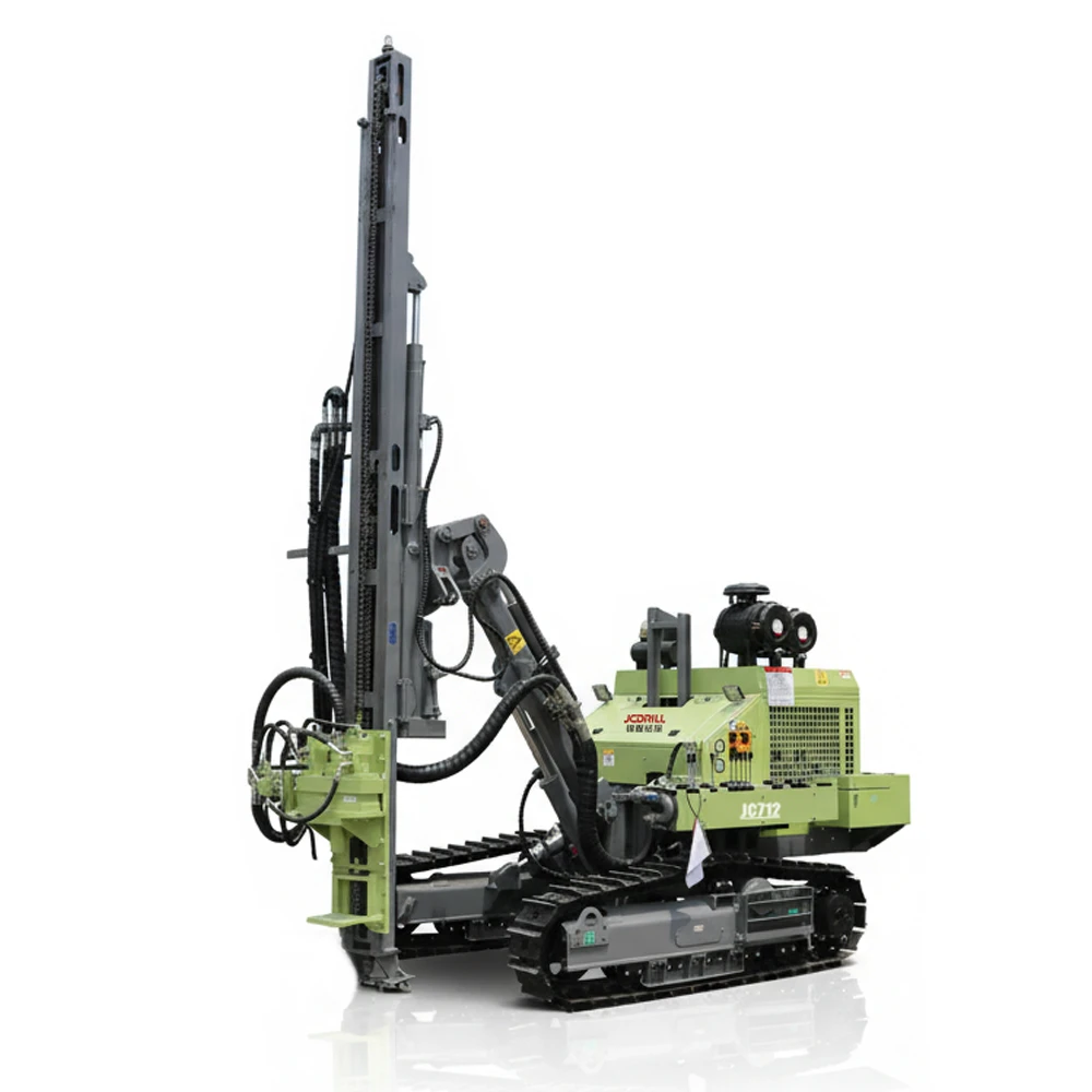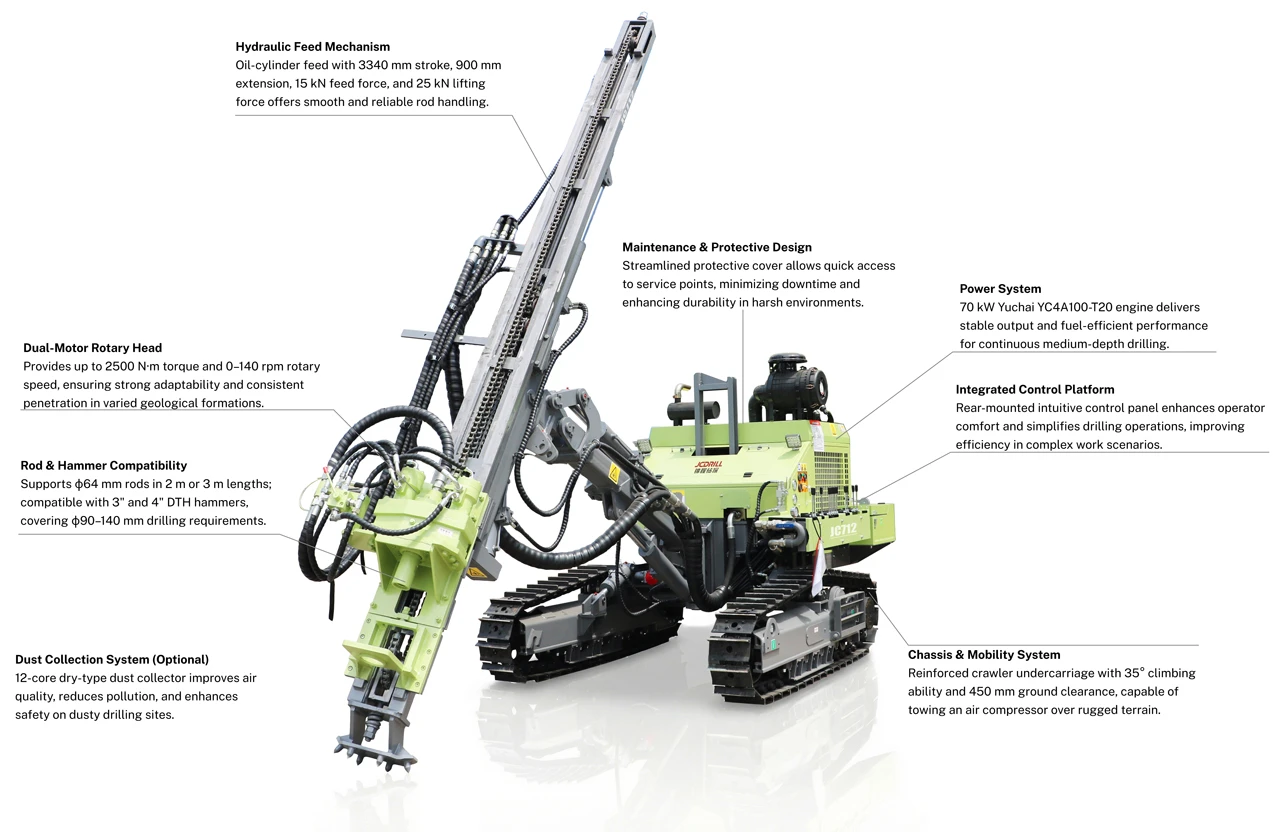 The JC712 is a fully hydraulic down-the-hole drilling rig designed for medium-depth drilling across diverse geological formations. It supports drilling depths up to 35 meters with 2–3 meter drill rods and accommodates φ90–140 mm hole diameters. Powered by a fuel-efficient 70 kW Yuchai YC4A100-T20 engine, the rig features a dual-motor high-torque rotary system, oil-cylinder feed mechanism, and rugged crawler chassis for reliable performance, smooth rod handling, and strong off-road mobility. Its compact dimensions, ergonomic control panel, and optional 12-core dry-type dust collection system ensure operational efficiency, safety, and environmental friendliness, making JC712 ideal for construction, geothermal drilling, water wells, and geological exploration in challenging terrains.