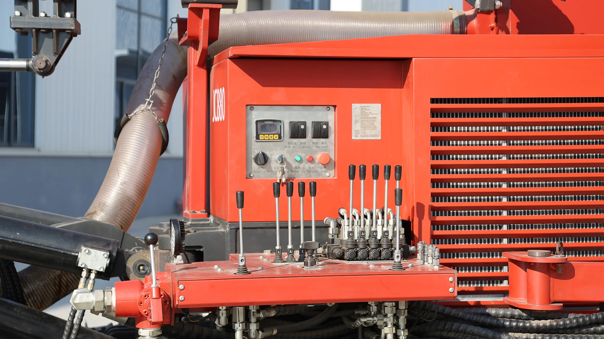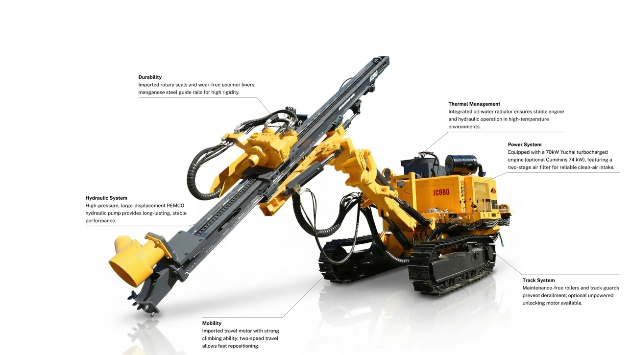 The JC880 is an upgraded fully hydraulic down-the-hole drilling rig designed for mining, quarrying, blasting, and civil engineering applications. With hole diameters from φ90 to 165 mm and drilling depths up to 40 meters, it delivers high rotary torque and smooth, stable operation. Powered by a Yuchai 70 kW turbocharged diesel engine (Cummins 74 kW optional) or an electric motor, all drilling, feeding, lifting, traveling, and positioning functions are hydraulically controlled for optimal efficiency.