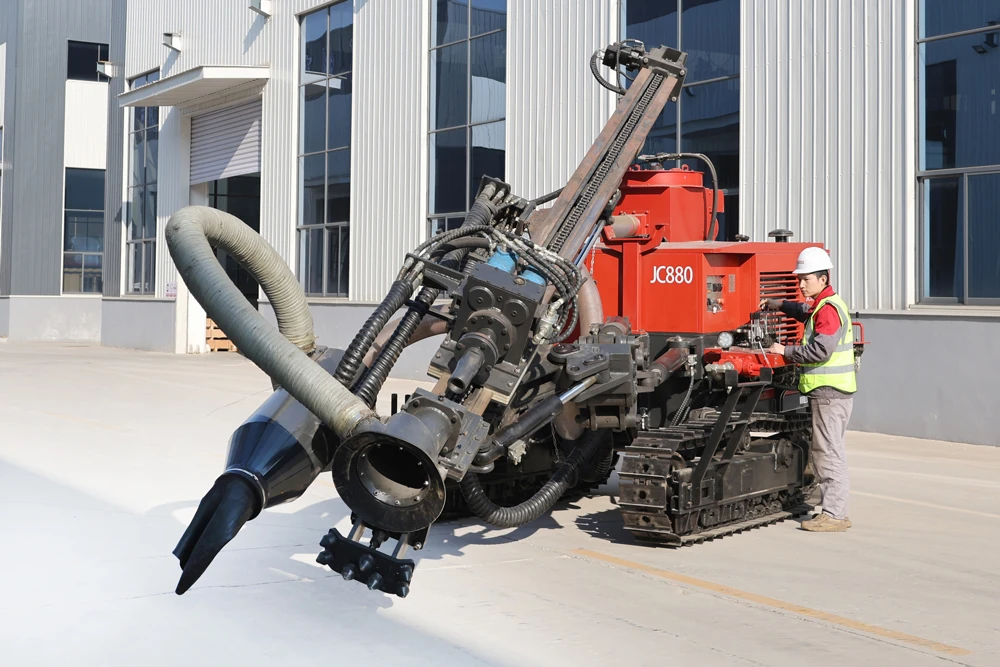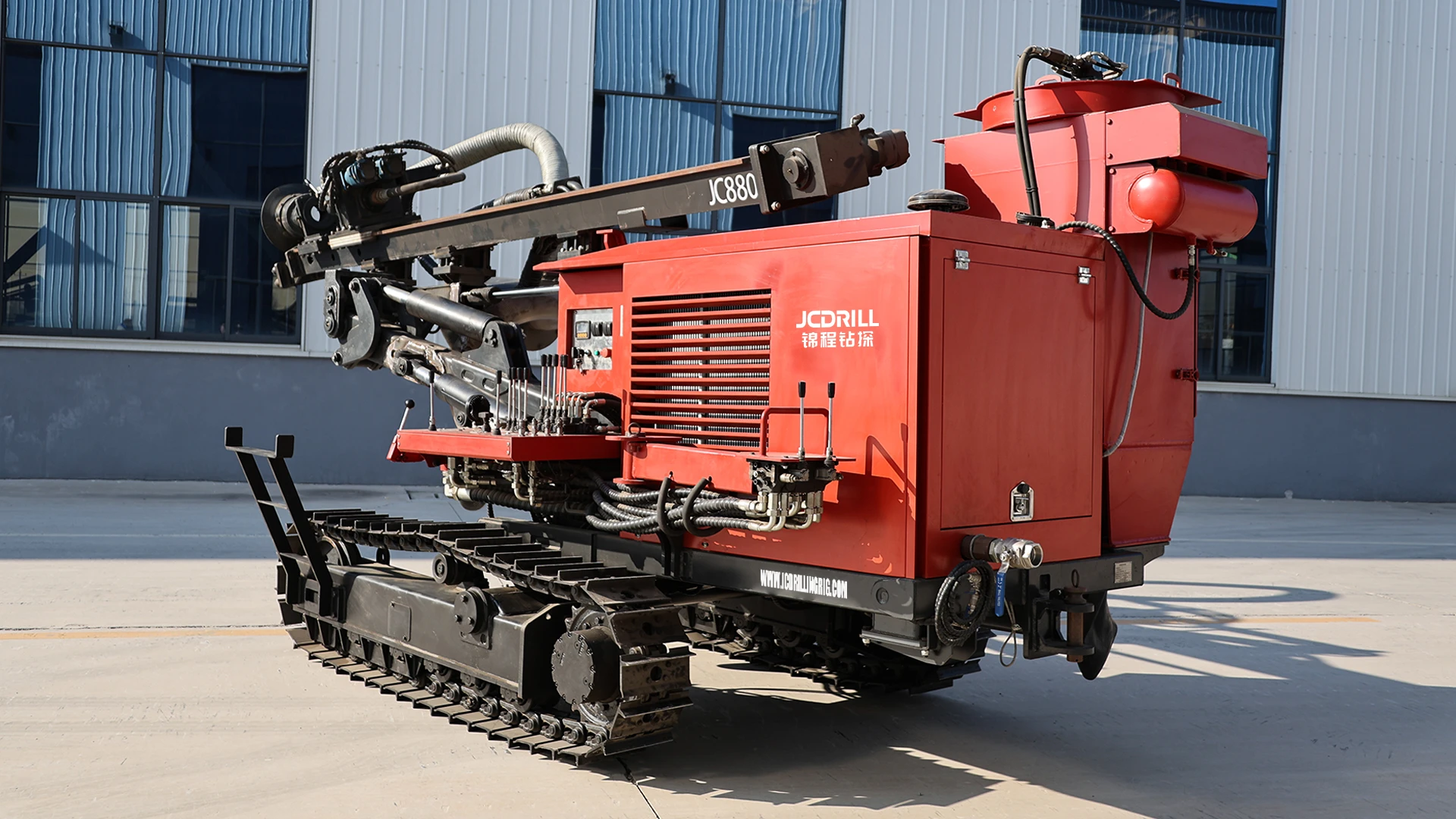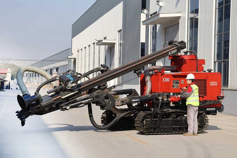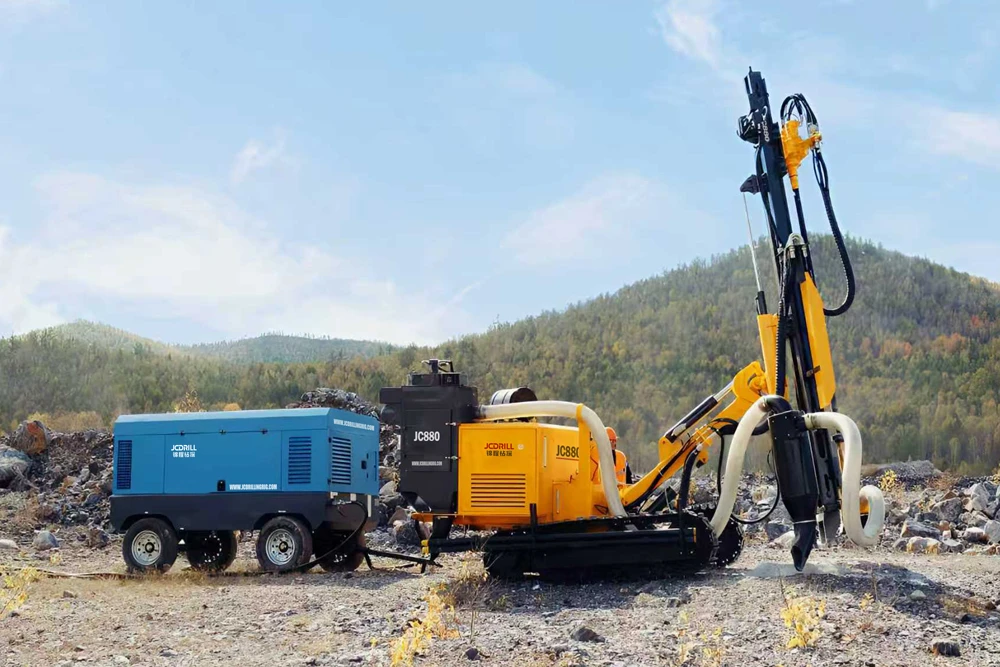 As an upgraded model of JC880, the new JC880 hydraulic down-the-hole drilling rig delivers enhanced performance with an optimized structure, lower drilling cost per meter, and a more user-friendly design. Powered by a diesel engine (or electric motor) driving a hydraulic pump set, all drilling, feeding, lifting, traveling, and positioning functions are hydraulically controlled, providing high rotary torque and smooth operation. The newly designed planetary gearbox features a compact structure, higher reduction ratio, and improved torque transmission efficiency, eliminating the need for damping joints and reducing failure and maintenance rates. High-quality imported rotary seals, wear-resistant polymer liners, and manganese steel guide rails ensure durability, reliable hole formation, and long service life, even in unconsolidated formations.