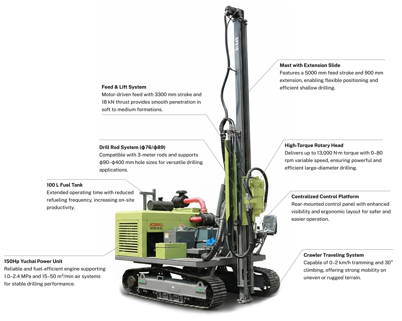 Powered by a 150 HP Yuchai diesel engine, the SP619 features a high-torque rotary system delivering up to 13,000 N·m with variable speed control up to 80 rpm. Its lightweight 6.0-ton crawler structure, combined with strong feed force, long feed stroke, and excellent off-road mobility, ensures stable, efficient drilling even in soft, loose, or unstable formations. Compatible with a wide range of air compressors, the SP619 offers reliable performance, easy transportation, and fast site setup.