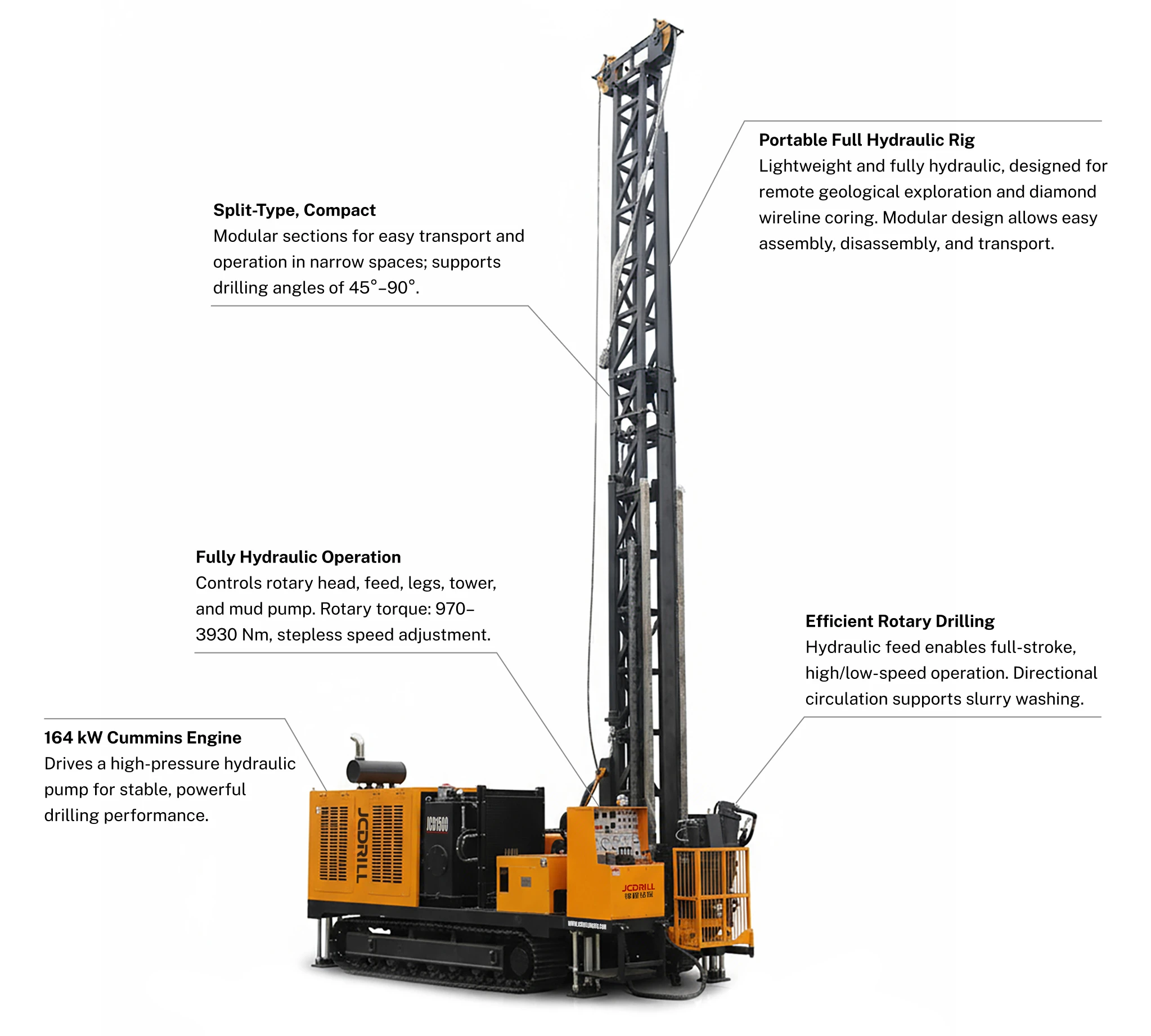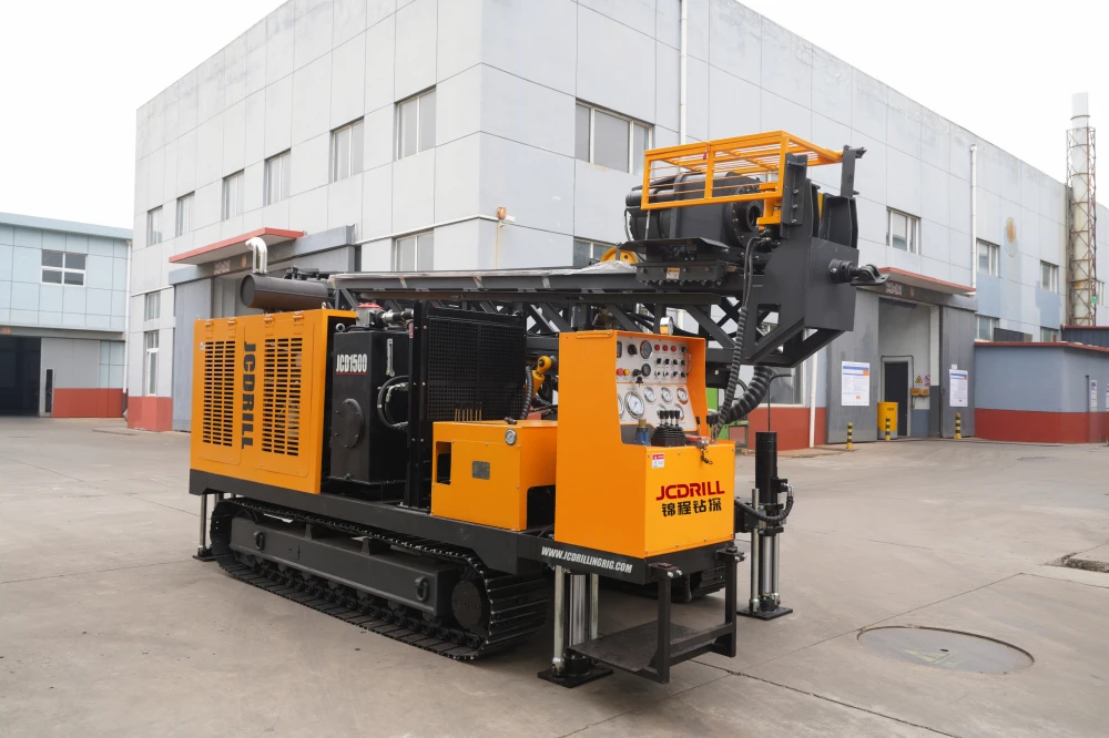 The JCD1500 Full Hydraulic Portable Drilling Rig is a lightweight rig designed for geological exploration in remote, hard-to-access areas. Ideal for wireline diamond coring, it features a diesel power unit, hydraulic system, control panel, mast, winches, drill head, and feed system. Fully hydraulic operation ensures high penetration and reliability, while a modular design allows easy assembly and transport. Hydraulic landing legs, tower, and rotary head (970–3930 Nm, stepless speed) handle complex geological conditions efficiently.