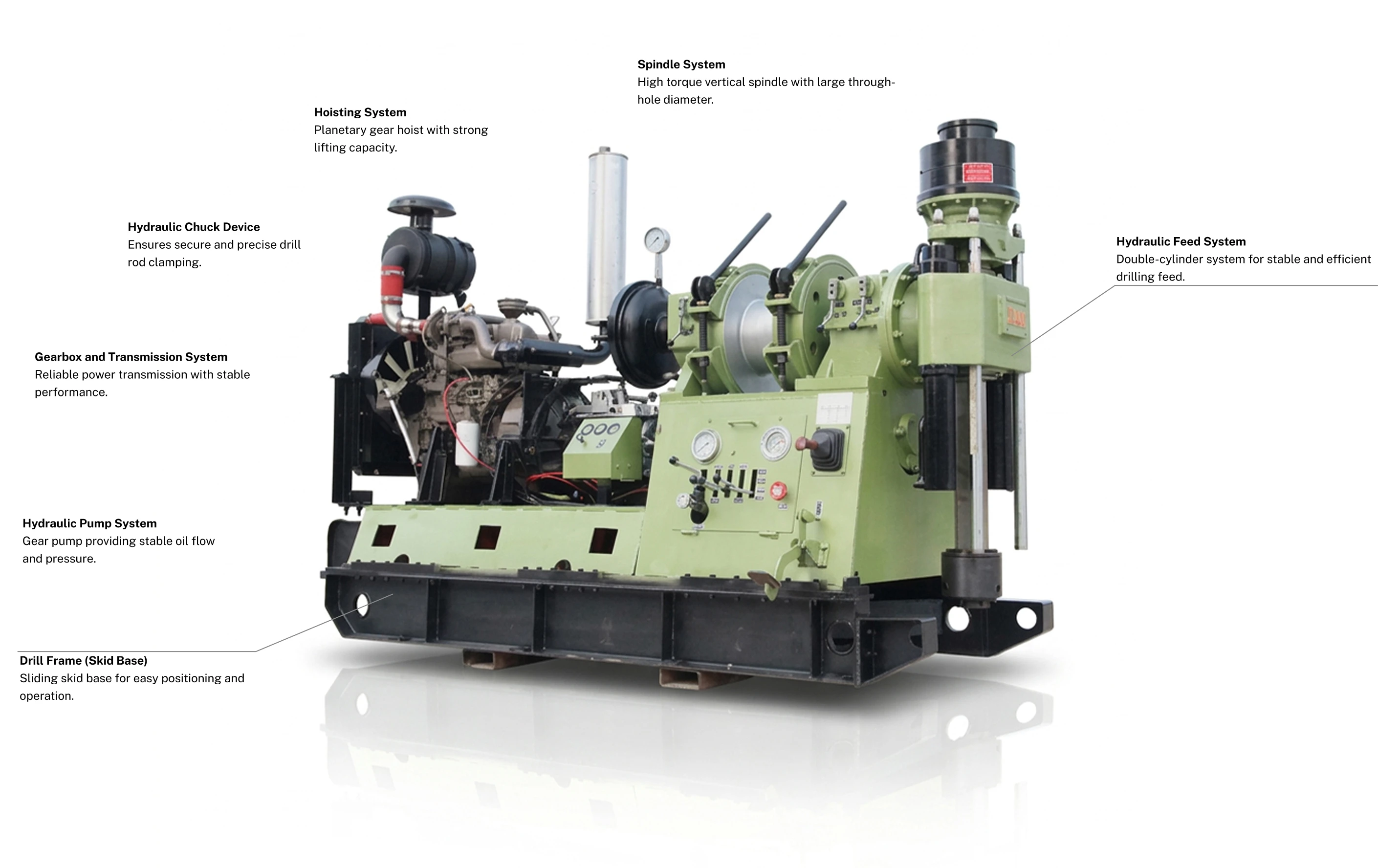 The XY-44A core drilling rig is a high-torque spindle-type drilling machine designed for geological exploration, hydrological drilling, and foundation construction. It supports both diamond and carbide drilling methods, making it suitable for various formations. With a wide speed range and strong torque output up to 8000 N·m, the rig ensures stable and efficient drilling performance. Its double-cylinder hydraulic feed system and long spindle stroke enhance drilling adaptability, especially for large-diameter coring operations in complex geological conditions.
