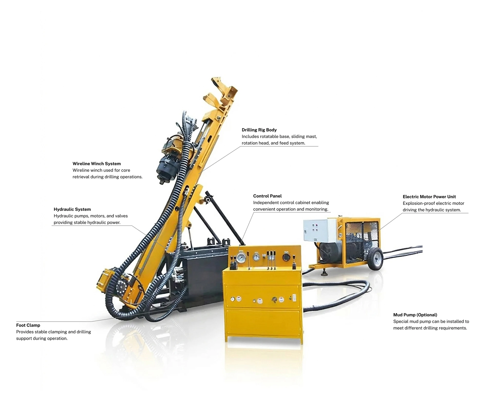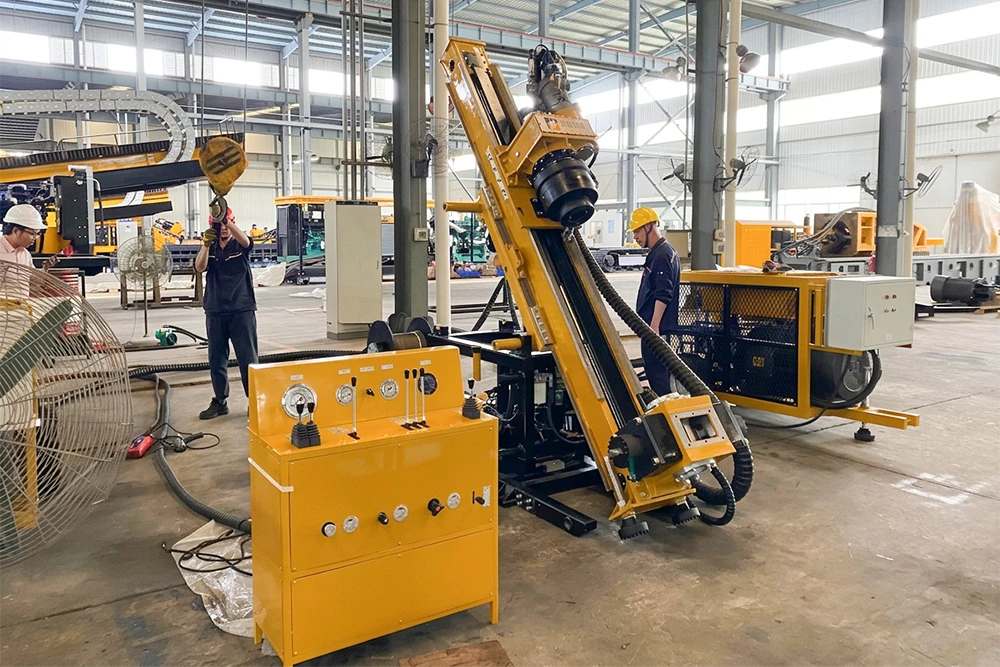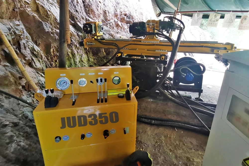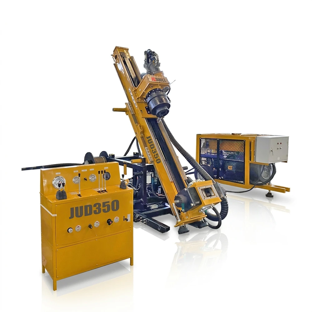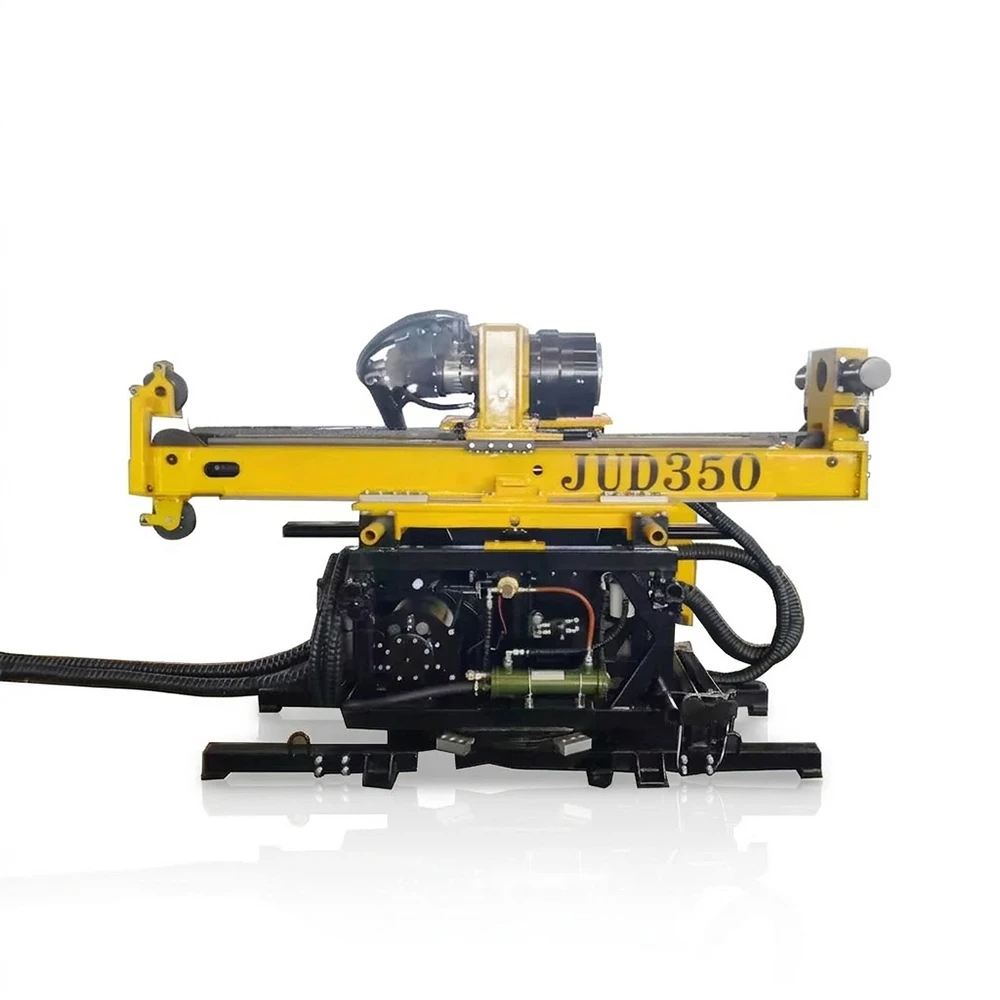The JUD350 underground core drilling rig adopts a modular structural design that separates the rig body, power unit, and control system for convenient transportation and underground assembly. The hydraulic system is driven by an explosion-proof electric motor, providing stable rotation and feeding performance. With an adjustable mast and swinging arm structure, the rig allows flexible drilling angles from horizontal to vertical positions. Its wide rotary speed range and reliable hydraulic components ensure efficient and stable drilling performance in underground exploration projects.